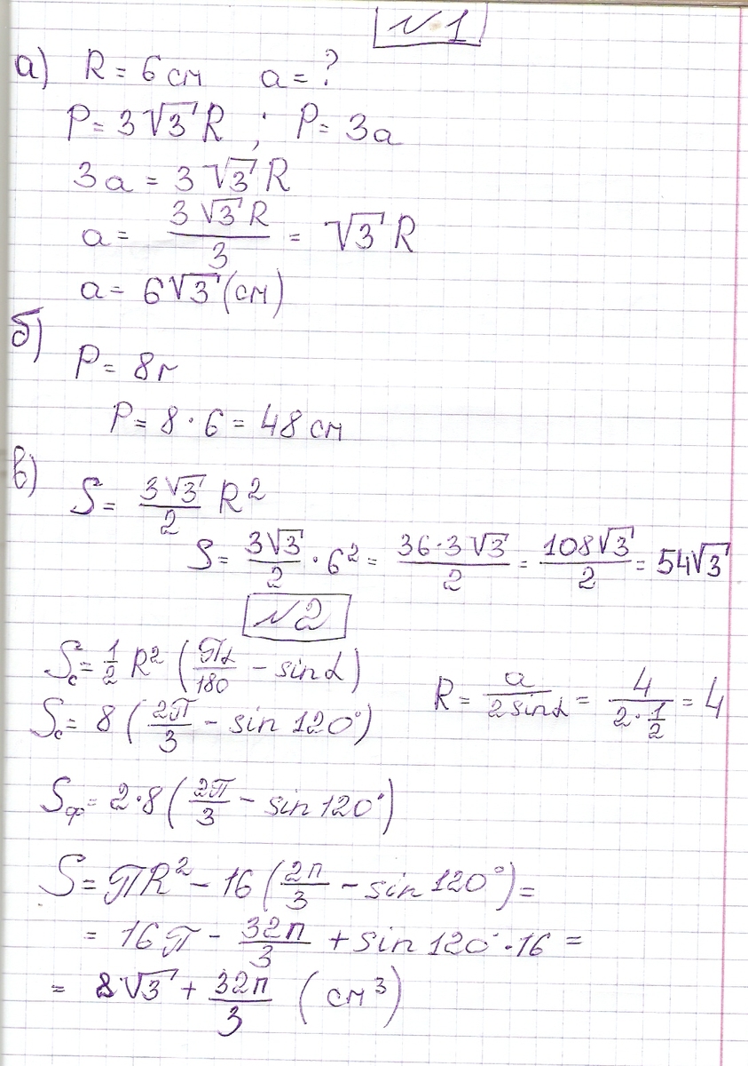 #1) Дана окружность радиуса 6 см .Найдите: а)сторону правильного вписанного треугольника б)периметр правильного описанного четырёхугольника в)площадь правильного вписанного шестиугольника №2)В круге из одной точки окружности проведены две хорды,составляющие угол 120 градусов.Найдите площадь части круга,заключенной между ними,если длина каждой хорды равна 4 см №3)Две окружности,радиусы которых равны 4 корня из 2,имеют общую хорду длиной 8 см.Найдите периметр ограниченной этими окружностями фигуры и расстояние между центрами окружностей.