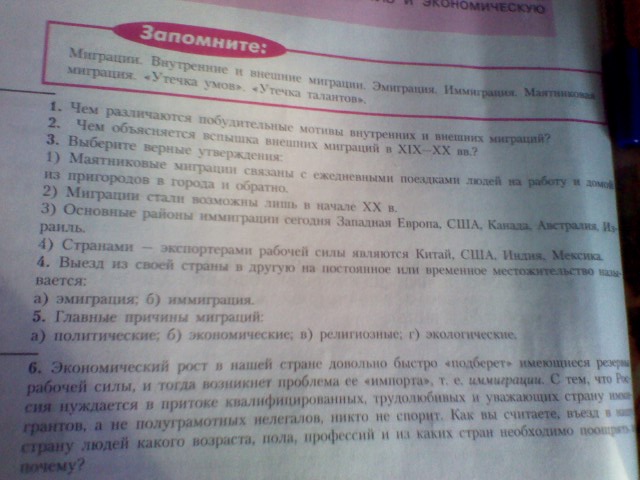 ответ на вопрос 5: главной причиной миграций является экономические.