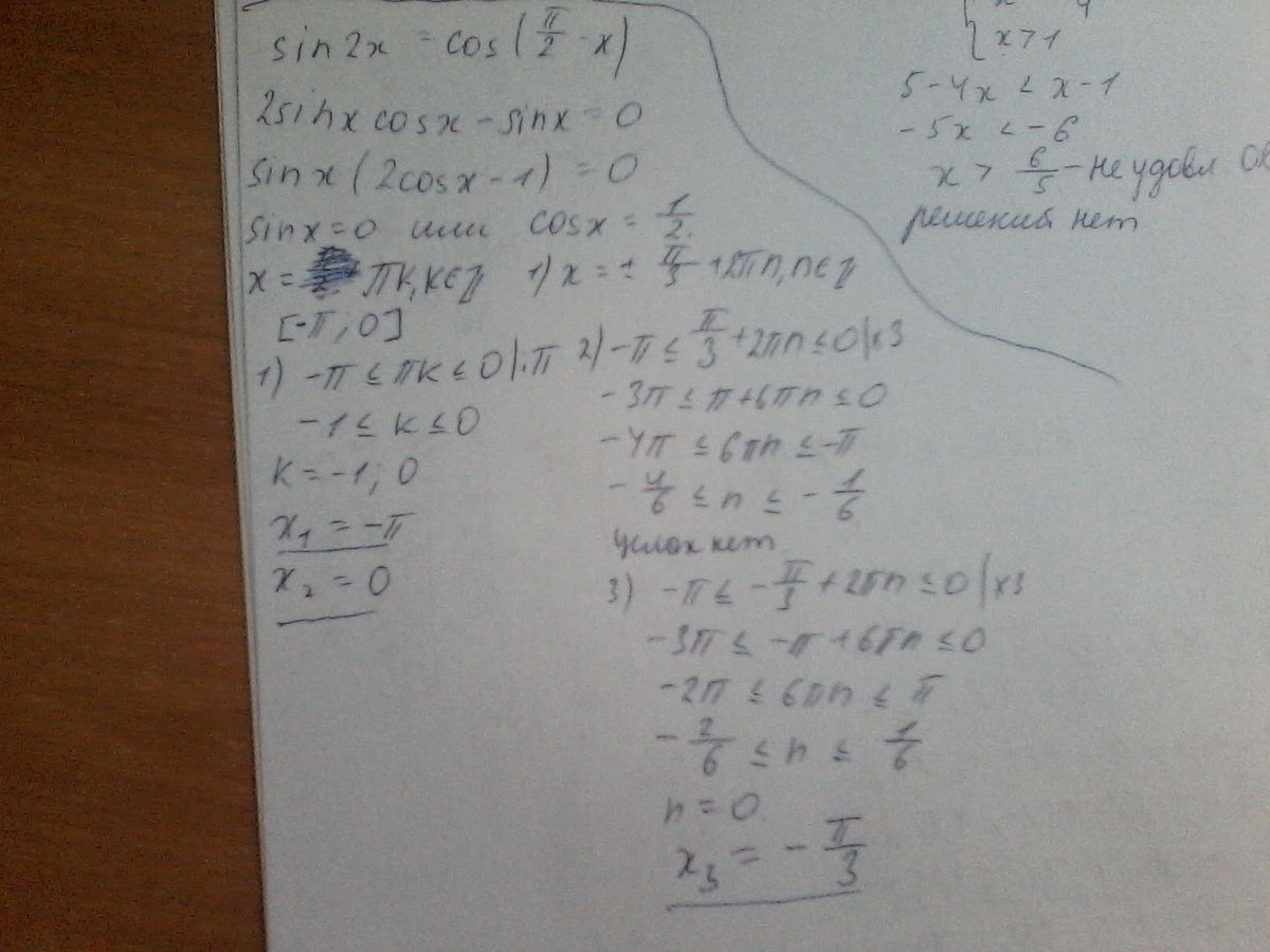 найдите корни уравнения sin2x=cos(pi/2-x) принадлежали промежутку [-pi; 0]