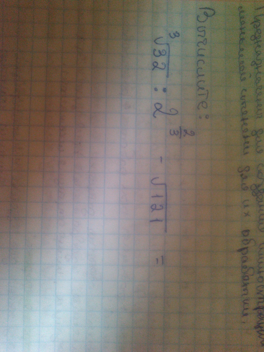 \sqrt[3]{32} : 2^{ \frac{2}{3} } - \sqrt{121} = \frac{\sqrt[3]{32}}{\sqrt[3]{4}} - \sqrt{121} = \sqrt[3]{ \frac{32}{4} } -11= \sqrt[3]{8} -11=2-11=-9