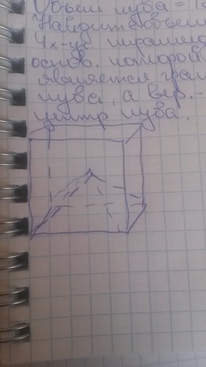 Объем Куба =12.Найдите объем 4х-уг. пирамиды, основания которой является грань Куба, а вершина центр куба.