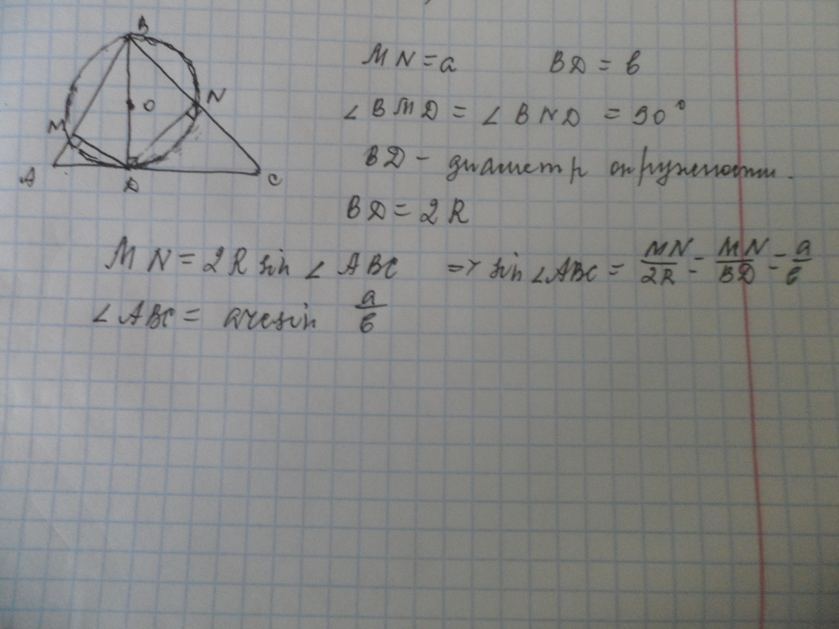 В остроугольном треугольнике ABC из основания D высоты BD опущены перпендикуляры DM и DN на стороны AB и BC. Известно, что MN = a, BD = b. Найдите угол ABC.