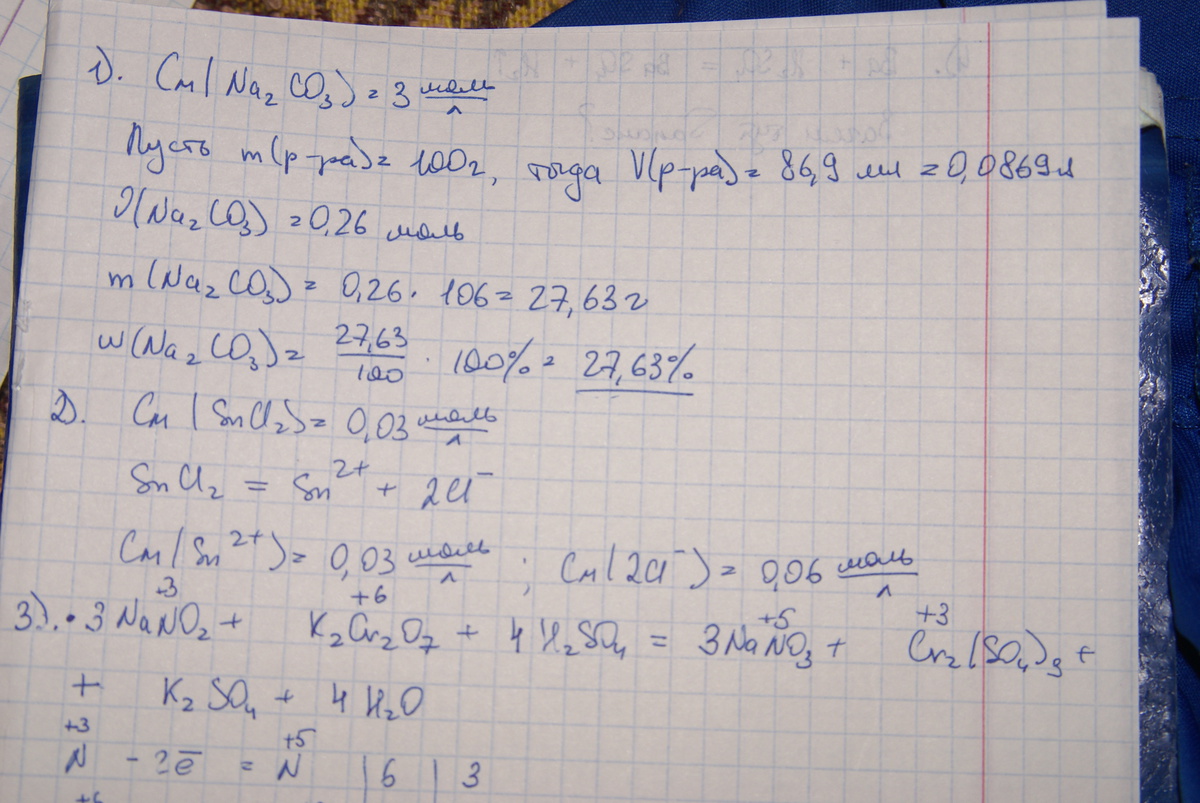 1) Вычислите массовую долю растворенного вещества в 3 М растворе карбоната натрия (плостность 1,15 г/мл)