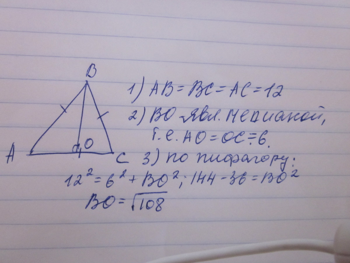 Треугольник равносторонний значит все стороны по 12 см, проводим высоту ВО , она составляет со стороной прямой угол и делит ее пополам. по теореме пифагора ВО^2=BC^2-CO^2 ответ : ВО = 4 корня из 5