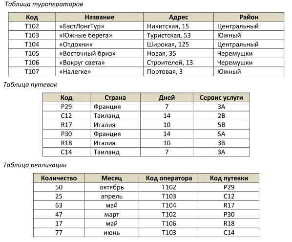 База данных о продажах горящих путевок состоит из трех связанных таблиц: (см. таблицу). Сколько путевок в Европу было продано в весенние месяцы туроператорами Центрального района?