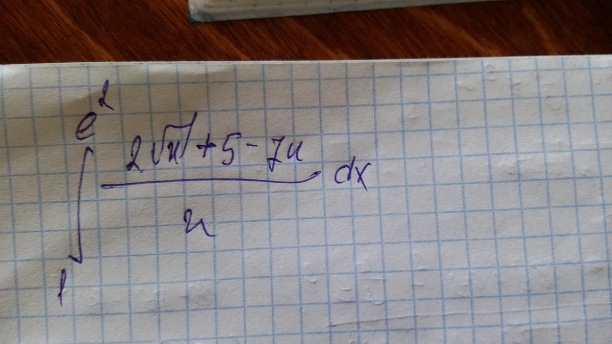 \int _1^{e^2}\frac{2\sqrt{u}+5-7u}{u}du=\int _1^{e^2}(\frac{2}{\sqrt{u}}+\frac{5}{u}-7)du=(2\cdot 2\sqrt{u}+5\cdot ln|u|-7u)_1^{e^2}=\\\\=4\sqrt{e^2}+5\cdot ln|e^2|-7e^2-(4+5ln1-7)=\\\\=4\cdot e+5\cdot 2-7e^2-4-0+7=13+4e-7e^2