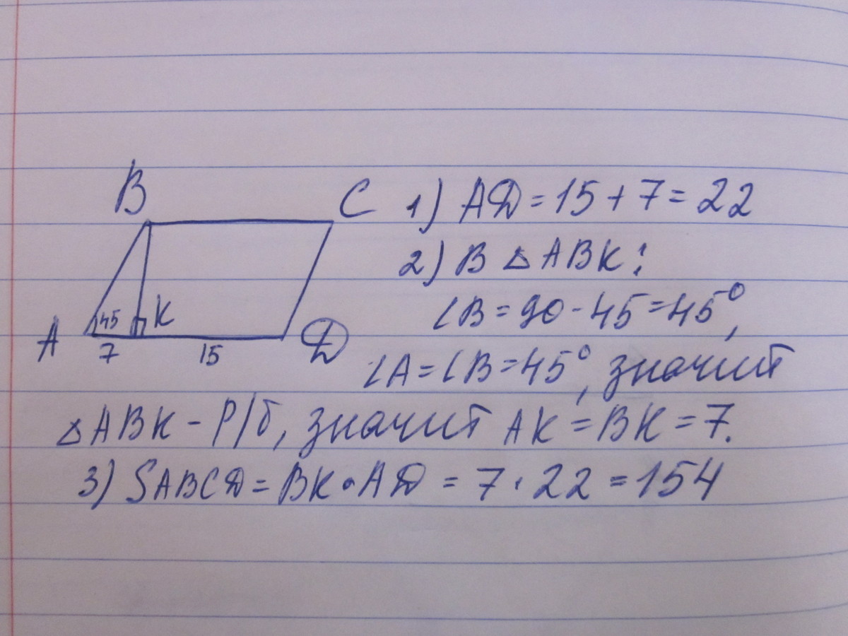 Высота ВК, проведенная к стороне АD, паралеллограмма АВСD, делит эту сторону на 2 отрезка, АК=7см, КD=15см. Найдите Sпаралеллограмма, если угол А=45градусов