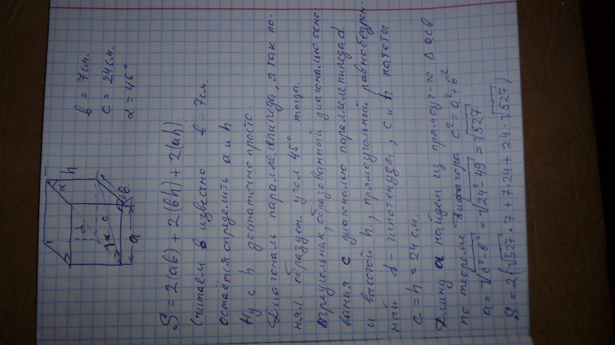 длина диагонали основания прямоугольного параллелепипеда равна 24 см его ширина 7 см, а угол между диагональю куба и плоскостью основания равна 45 градусов. Определите площадь полной поверхности прямоугольного параллелепипеда