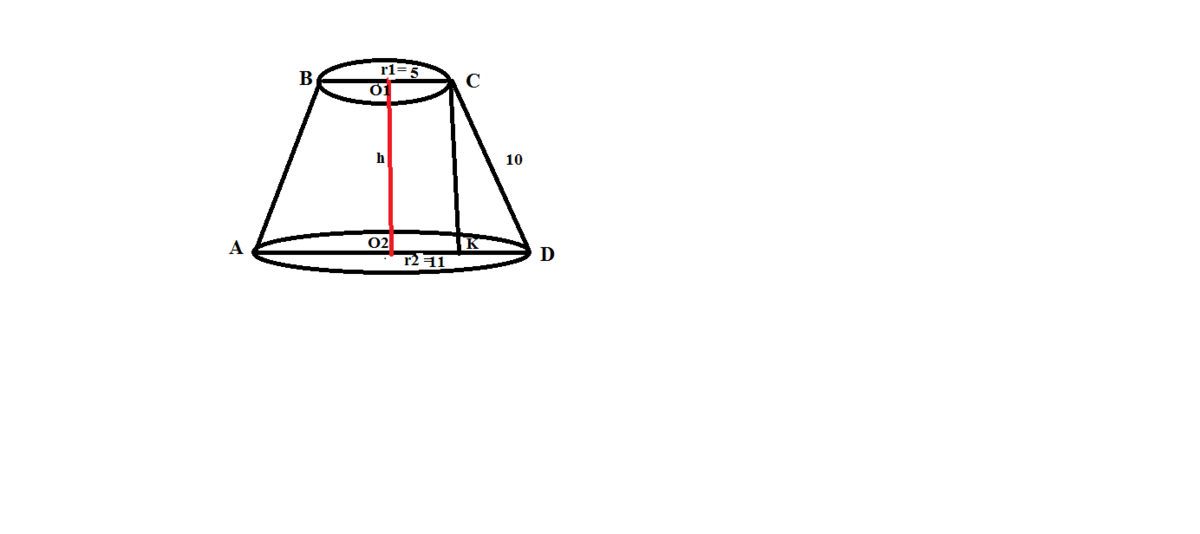 Длины радиусов оснований усечённого конуса равны 5 см и 11 см, а образующая-10см.Вычислить обЪём усечённого конуса. подробней решение если можно