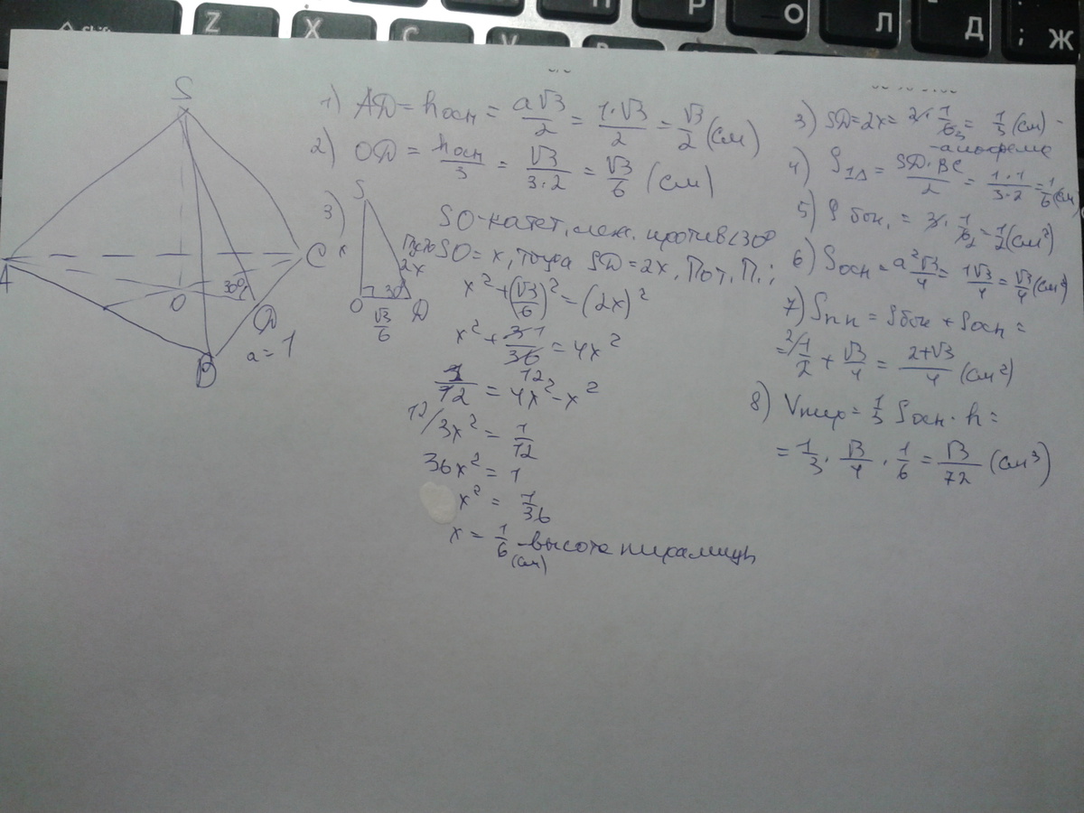 Помогите решить пожалуйста: В правильной треугольной пирамиде боковая грань образует с плоскостью основания угол 30 градусов.Найдите площадь полной поверхности и объём пирамиды если сторона основания 1 см .