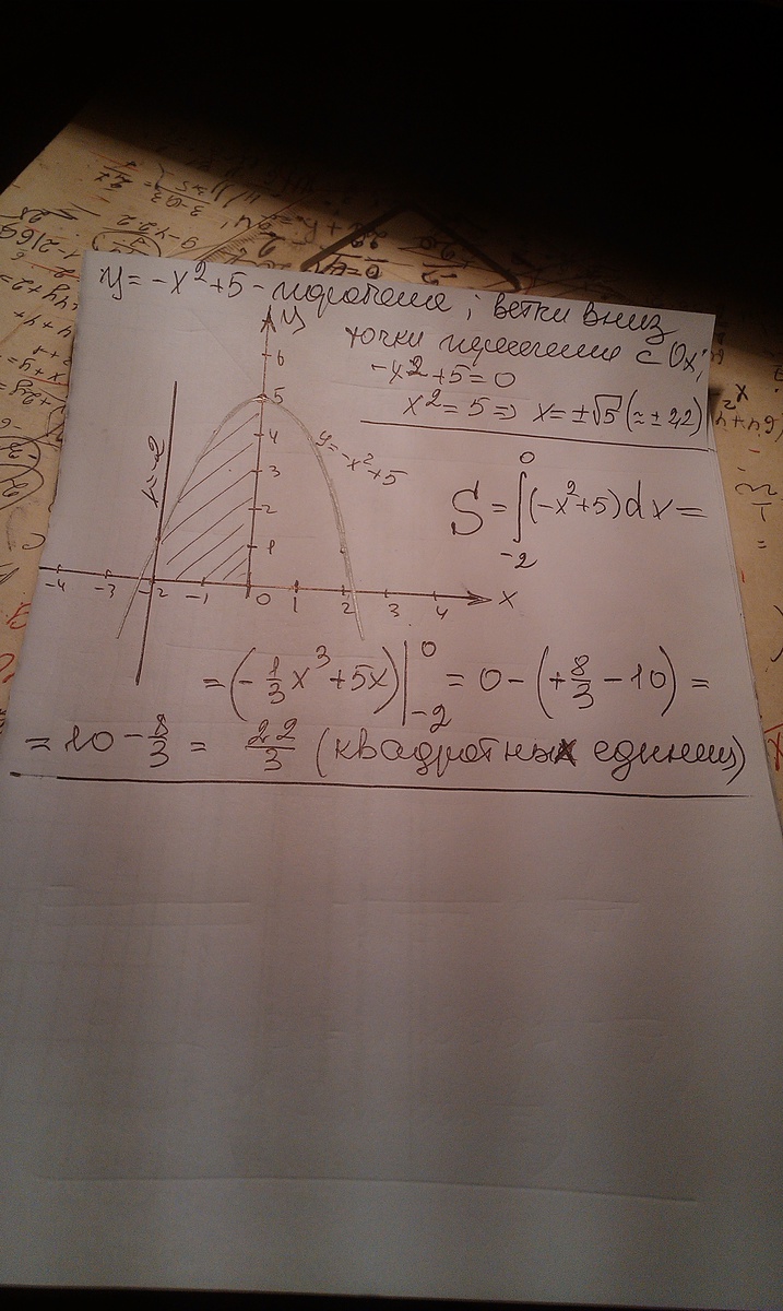 Помогите, вычислить площадь фигуры, ограниченной линиями(сделав рисунок) Y=-x^2+5 Y=0, x=-2, x=0