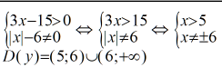 Знайдіть область визначення функції у=4/√3x-15 + 8/\х\-6