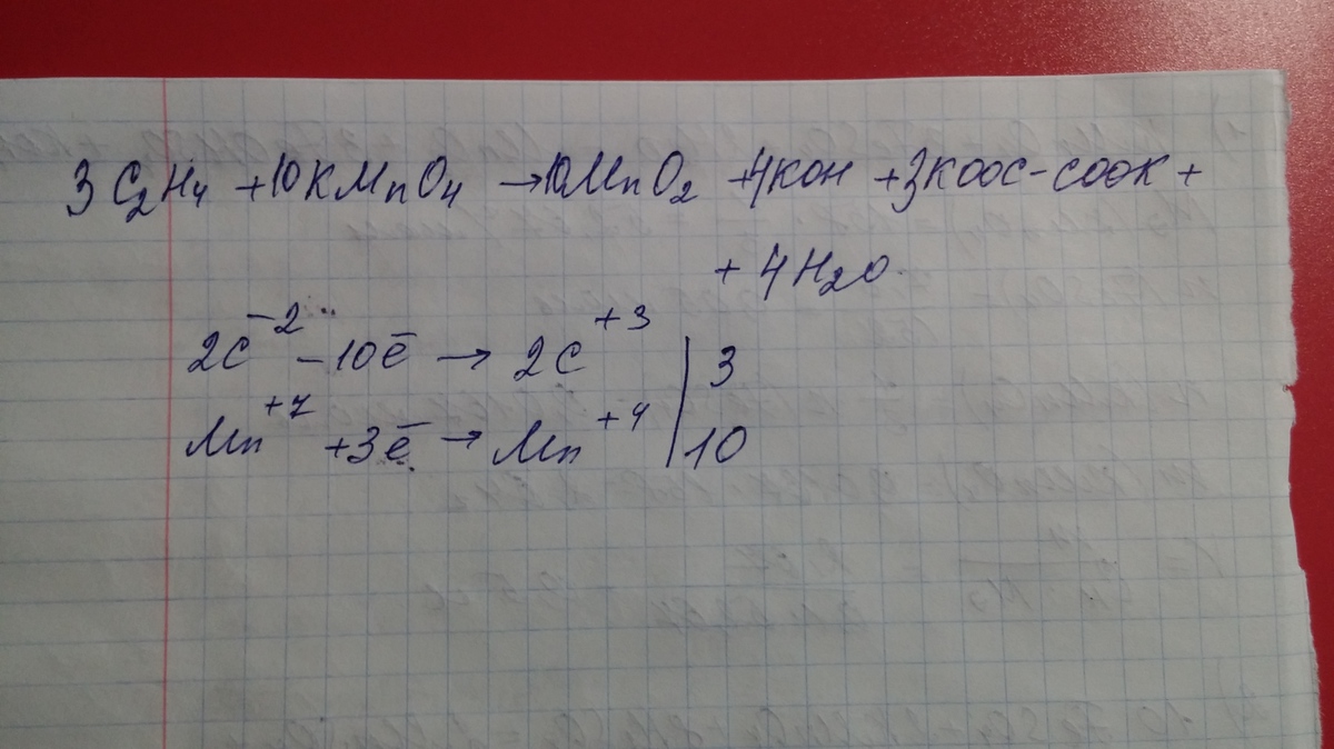 3C2H4 + 10KMnO4 = 10MnO2 + 4KOH + 3KOOC - COOK + 4H2O