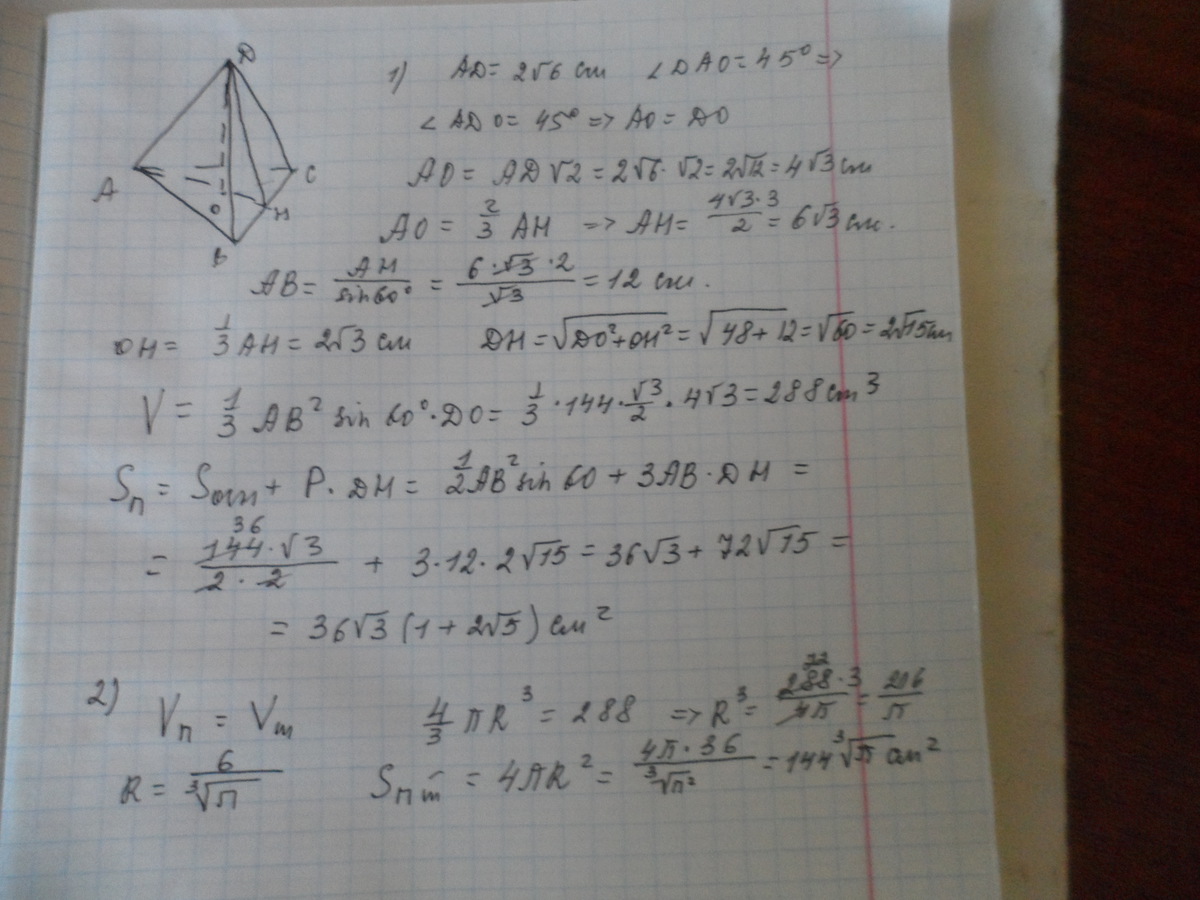 у правильній трикутній піраміді бічне ребро дорівнює 2√6 см і складає з площиною основи піраміди кут 45° .знайти:а)об'єм та площу повної поверхні піраміди б) площу поверхні кулі,яка рівновелика даній пірамід