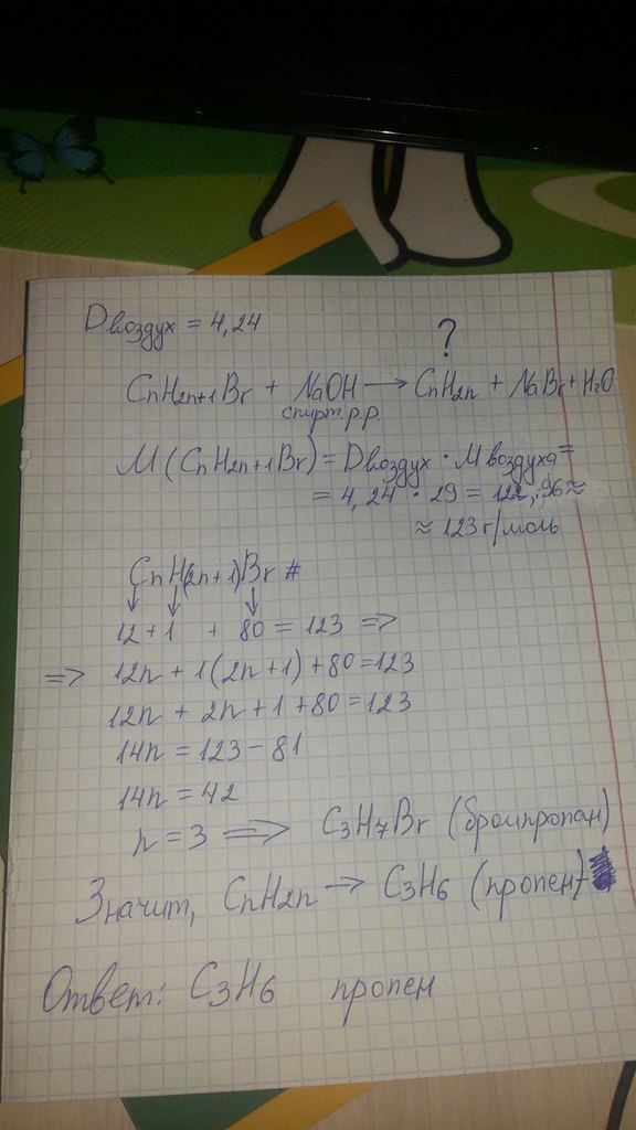Установите молекулярную формулу алкена, образовавшегося в результате взаимодействия спиртового раствора щёлочи с соответствующим монобромалканом, относительная плотность которого по воздуху равна 4,24.