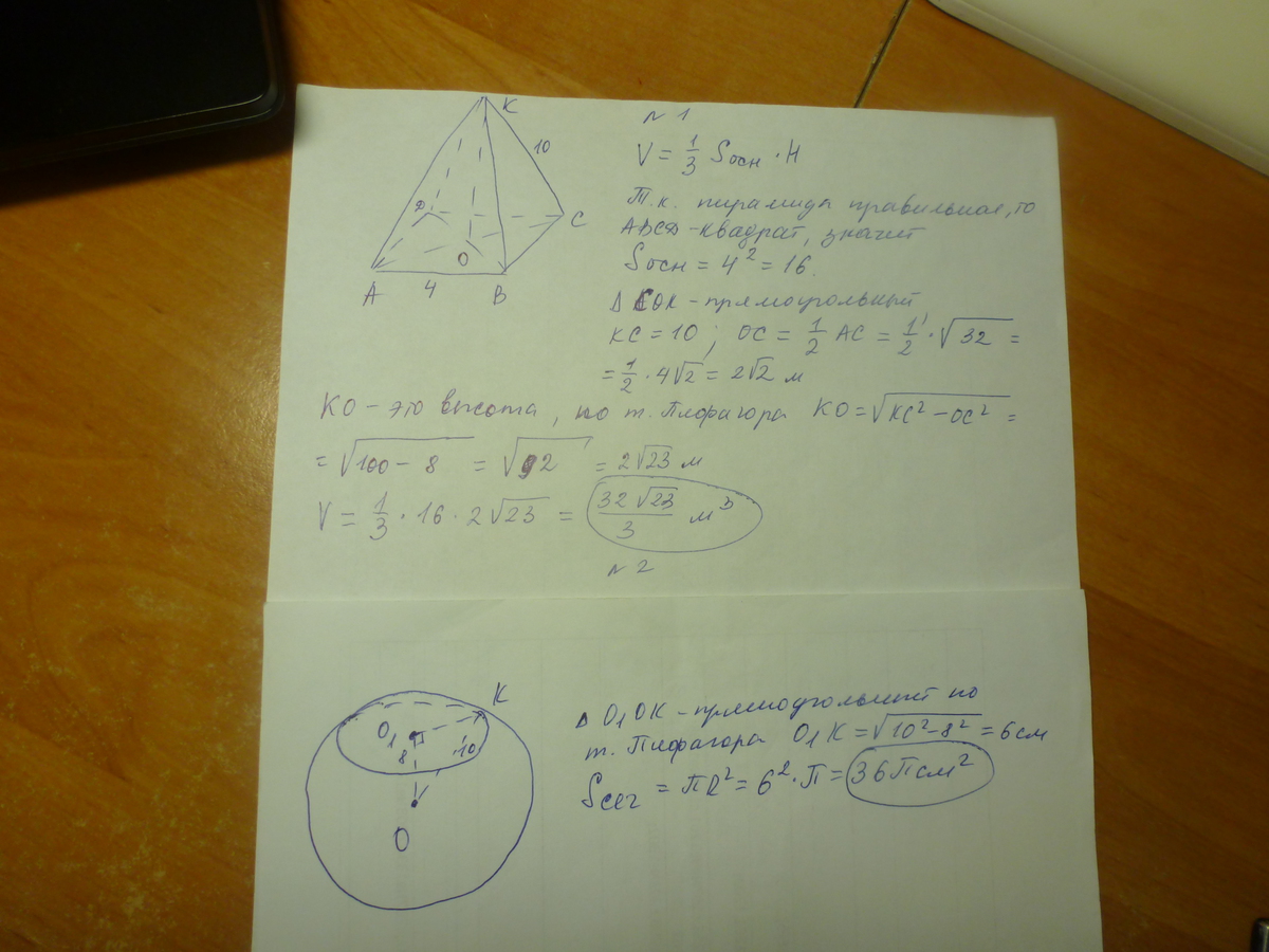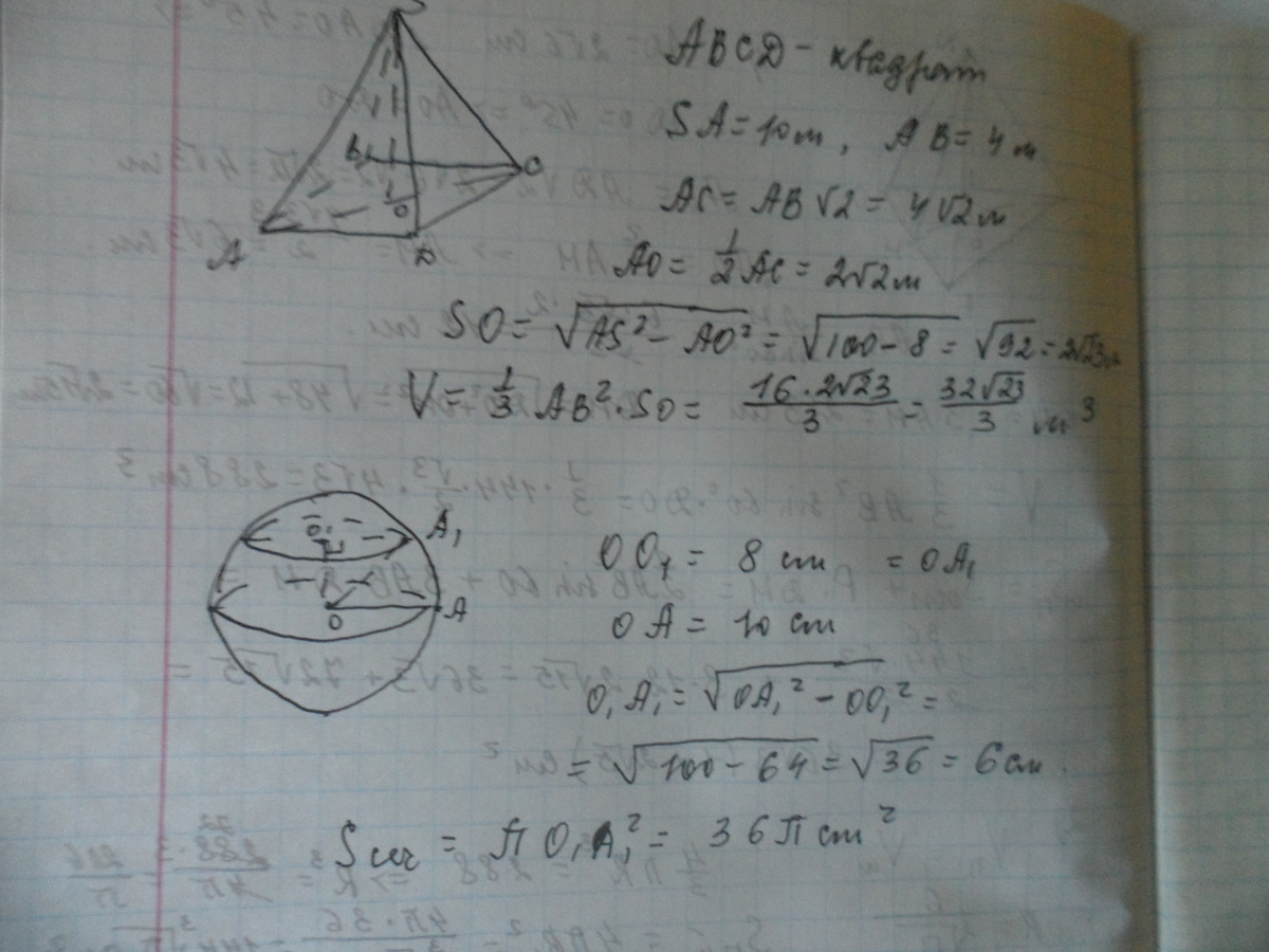 2)Найти площадь сечения шара плоскостью, проведенной на расстоянии 8см от центра если радиус шара равен 10см.