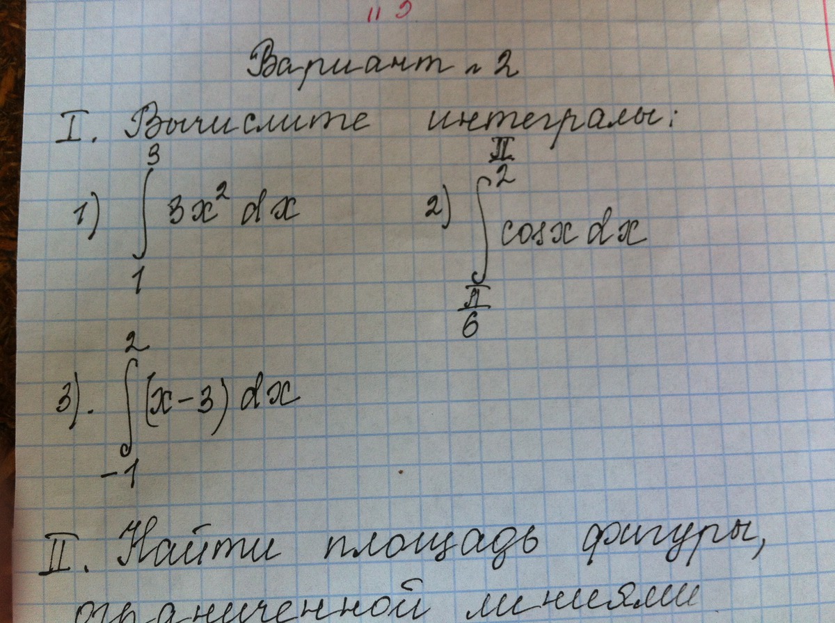 \int _1^33x^2\, dx=3\frac{x^3}{3}|_1^3=3^3-1^3=27-1=26\\\\\int _{\frac{\pi}{6}}^{\frac{\pi}{2}}cosx\, dx=}}sinx|_{\frac{\pi}{6}}^{\frac{\pi}{2}}=sin\frac{\pi}{2}-sin\frac{\pi}{6}=1-\frac{1}{2}=\frac{1}{2}\\\\\int _{-1}^2(x-3)dx=(\frac{x^2}{2}-3x)|_{-1}^2=2-6-(\frac{1}{2}+3)=-4-3,5=-7,5