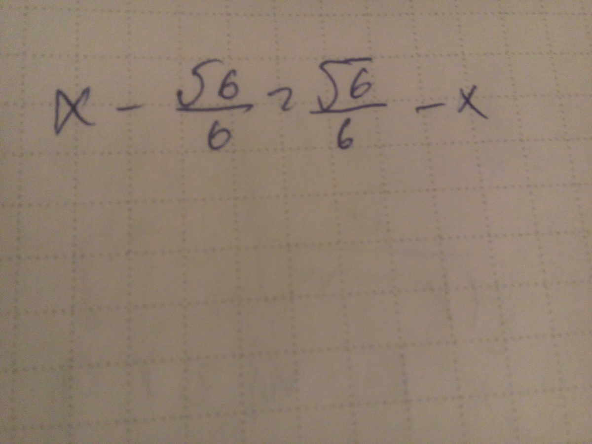 x- \frac{ \sqrt{6} }{6} =\frac{ \sqrt{6} }{6}-x\\x+x=\frac{ \sqrt{6} }{6}+ \frac{ \sqrt{6} }{6}  \\ 2x= \frac{2 \sqrt{6} }{6} \\2x=\frac{ \sqrt{6} }{3} \\x= \frac{ \sqrt{6} }{6}
