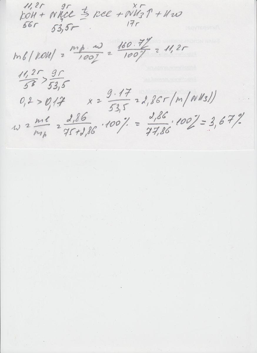 Газообразный аммиак, выделившийся при кипячении 160 г. 7%-ного раствора гидроксида калия с 9 г , хлорида аммония , растворили в 75 г. воды .Определить массовую долю аммиака в полученном растворе.