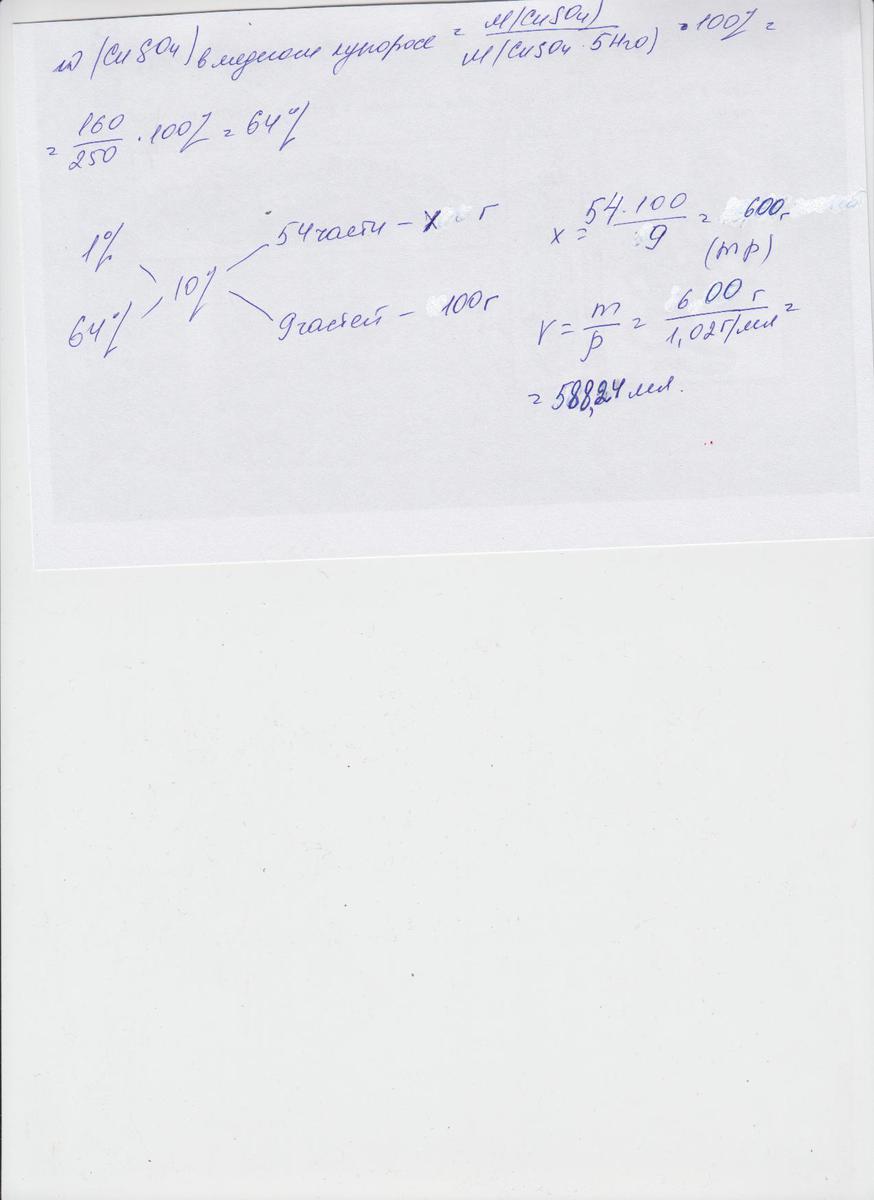 Какого объёма раствор с массовой долей CUSO4, равной 1 % ( плотность 1,02 г/мл), потребуется для растворения 100 г медного купороса CUSO4*5H2O, если надо получить раствор, в котором массовая доля CUSO4 составляла бы 10 %?