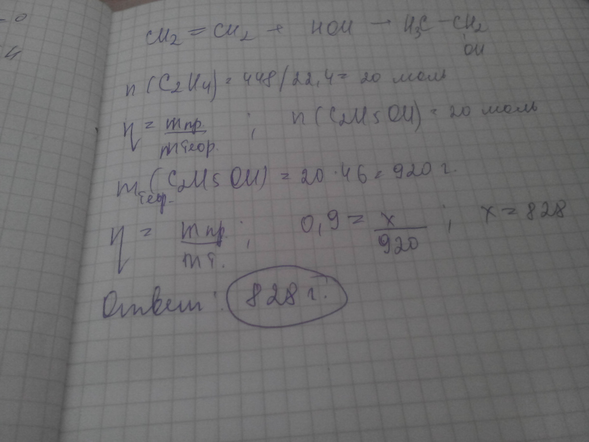 Вычислите массу (г) этанола, который можно получить гидратацией этена объемом 448 л (н. у.), если относительный выход продукта реакции составляет 90 %.