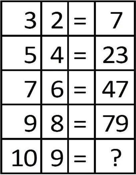 Здесь есть одна проблема, как тогда получилось первое число 7? Ведь для него нет "верхнего множимого". Поэтому, я думаю, здесь другая закономерность, например, можно сказать, что надо перемножить эти числа и прибавить второе число минус 1. Т.е. 3*2+(2-1)=7, потом 5*4+(4-1)=23, 7*6+(6-1)=47, 9*8+(8-1)=79, и наконец, 10*9+(9-1)=98. Так что ответ, 98, а не 99 :)