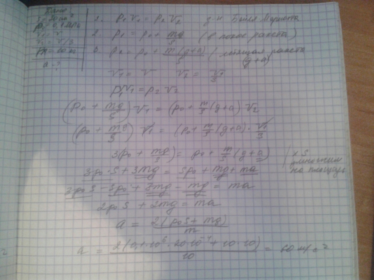 Цилиндр с площадью основания 20 см2, закрытый поршнем массой 10 кг, находится в стартующей вертикально ракете. Определить ускорение ракеты, если объем газа под поршнем в движущейся ракете в 3 раза меньше, чем в покоящейся. Давление воздуха в ракете po = 0,1 МПа.