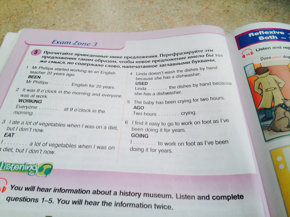 Лови:) 1. Mr Phillips has been teaching English for 20 years. 2. Everyone was working at 9 o'clock in the morning. 3. I used to eat a lot of vegetables when I was on a diet, but I don't now. 4. Linda isn't used to washing dishes by hand because she has a dishwasher. 5. Two hours ago the baby started crying. 6. I am going to work on foot as I have been doing it for years.