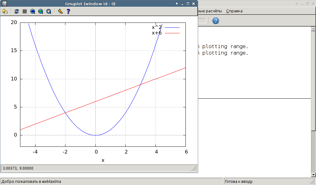 строишь y=x^2 и y=x+6, находишь точки пересечения по графикам, абциссы точек пересечения (иксы) - это ответ