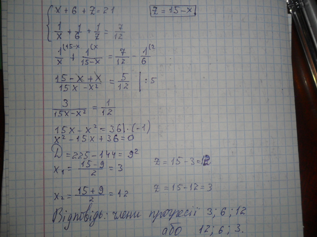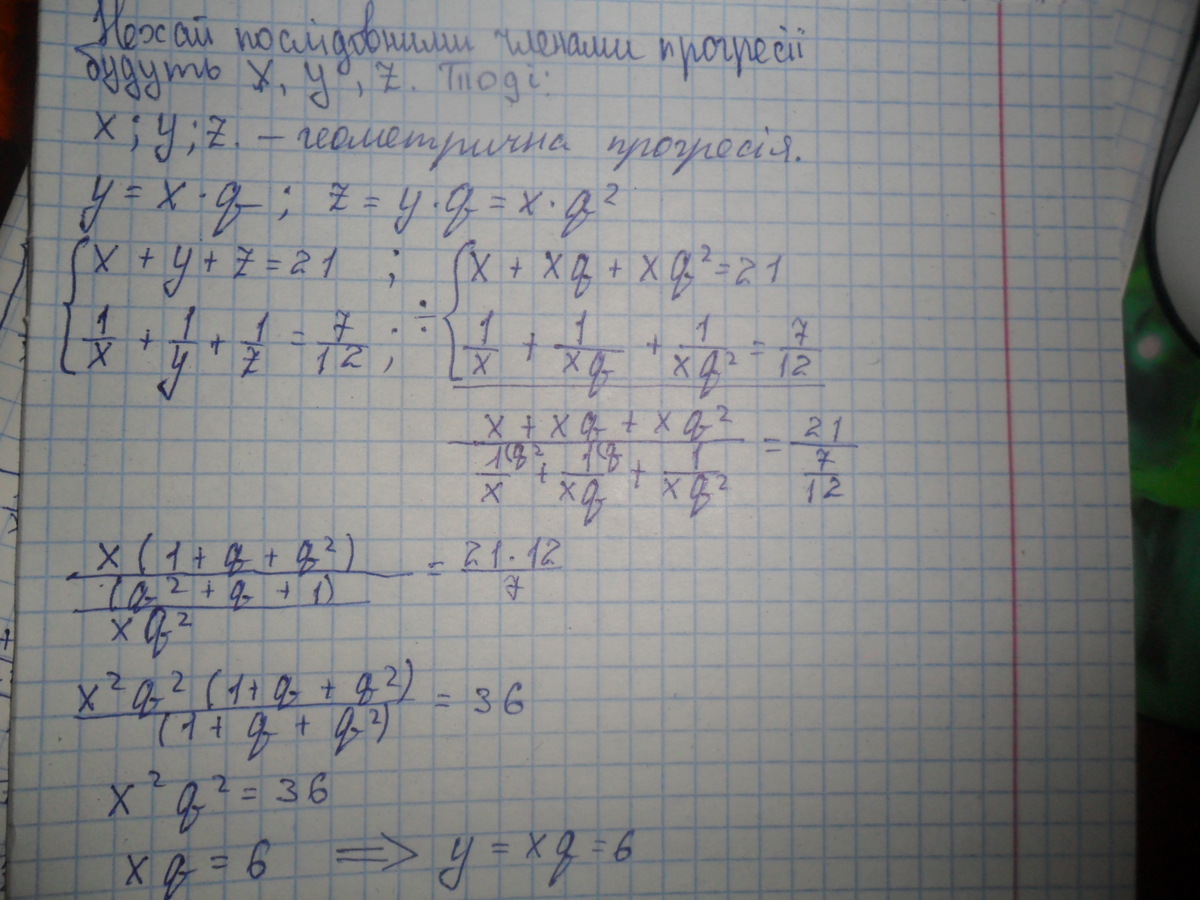 знайдіть три числа, які утворюють геометричну прогресію, якщо їхня сума дорівнбє 21, а сума обернених їм чисел 7/12