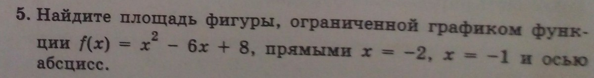 5. Найдите площадь фигуры, ограниченной графиком функции f(x)=x²-6x+8, прямыми x=-2, x=-1 и осью абсцисс.