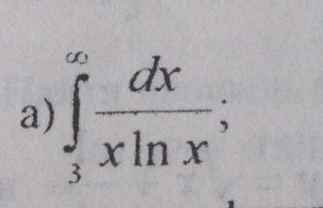 \int _3^{\infty}\frac{dx}{xlnx}=lim_{b\to +\infty}\int _3^{b}\frac{d(lnx)}{lnx}=lim_{b\to +\infty}ln|lnx|\, |_3^{b}=\\\\=lim_{b\to +\infty}(ln|lnb|-ln|ln3|)=+\infty-ln|ln3|=+\infty\; \; \to \; \; rasxoditsya
