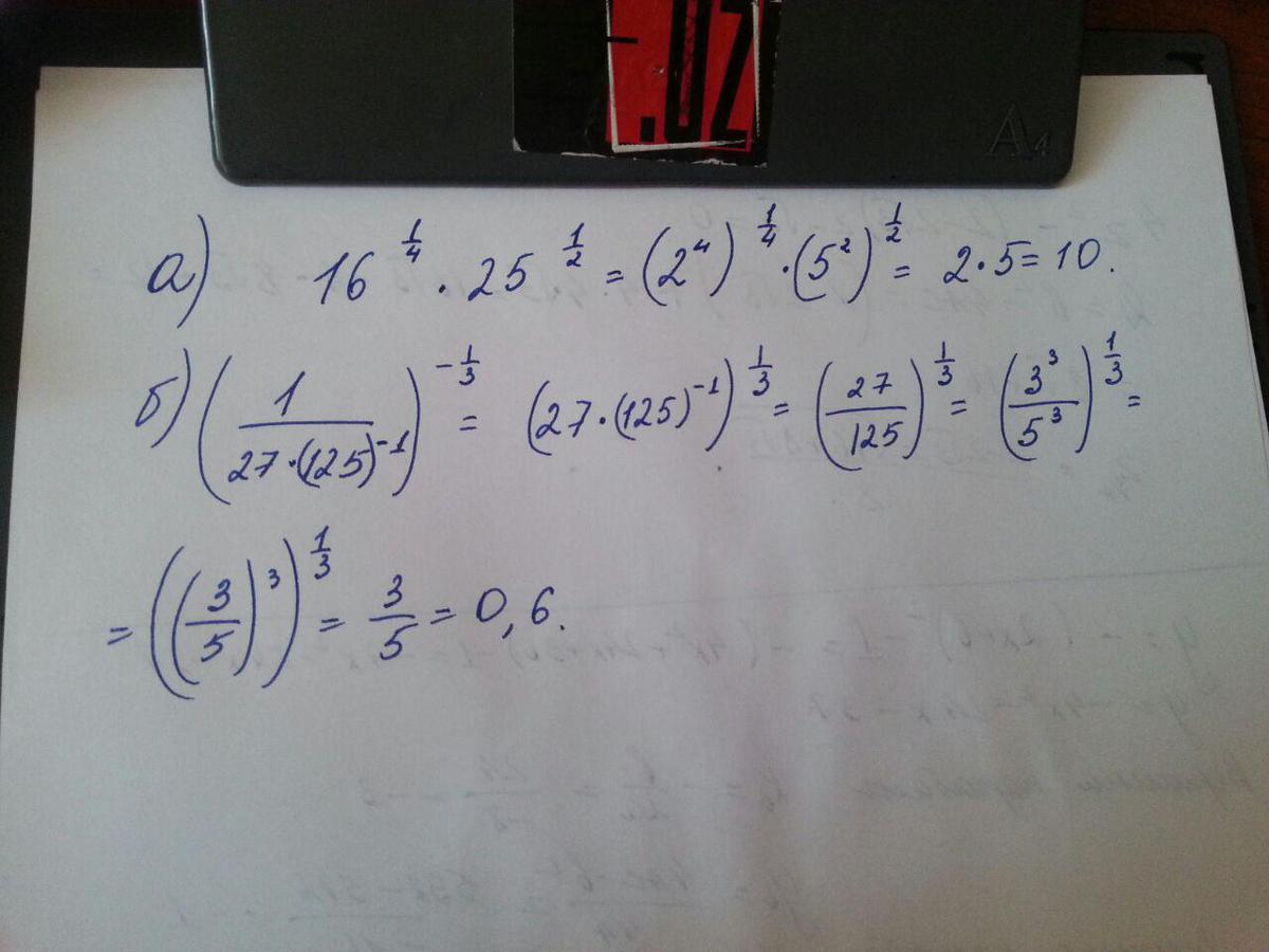 Вычислить а) 16^1/4*25^1/2 б) (1/27*125^-1)^-1/3