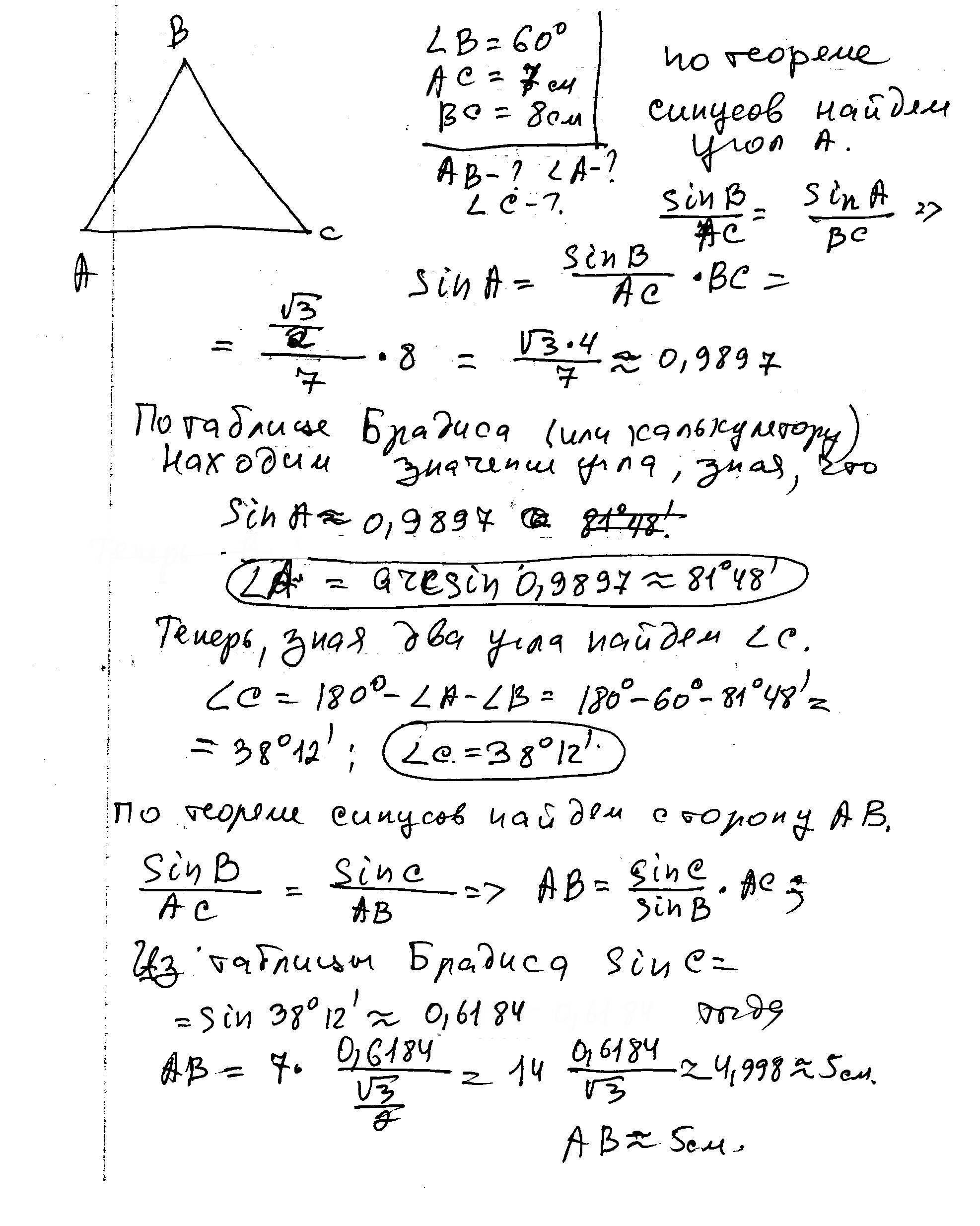 Решите треугольник ABC если BC=8 AC=7, а угол B=60 градусов. Напоминатю, решить треугольник - это найти все его углы, стороны. НАДЕЮСЬ НА ВАШУ ПОМОЩЬ)