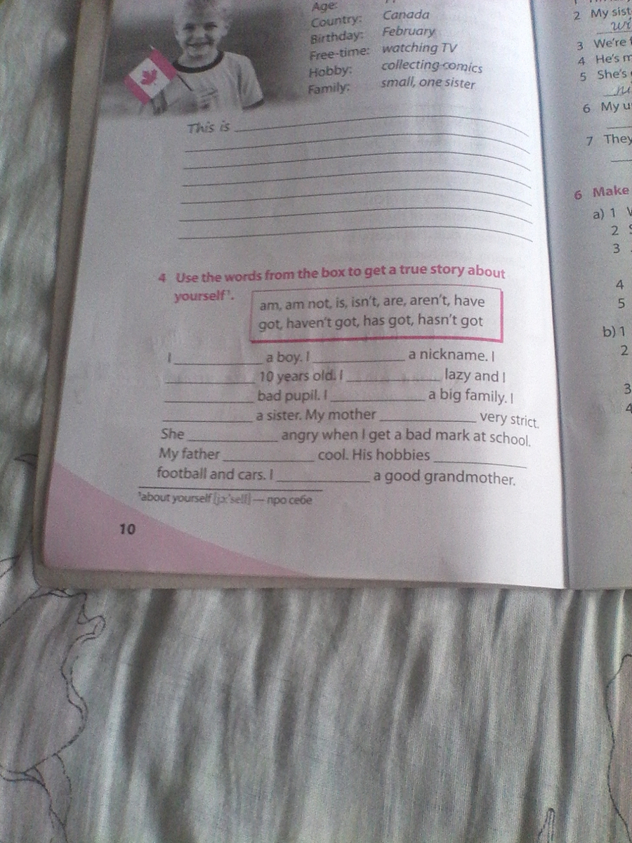 4) I am a boy. I have got a nickname. I am 10 years old. I am not a bad pupil.I haven't got a big family, I have got a sister. My mother is very strict. She is angry when I get a bad mark at school. My father is cool. His hobbies are football and cars. I have got a good grandmother.