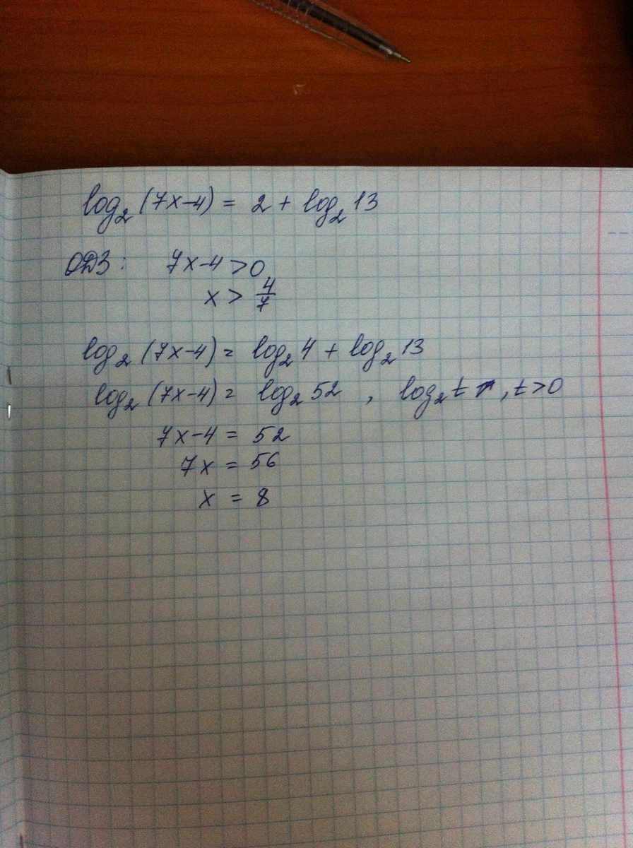 решите уравнение: log_2 (7x-4)=2+log_2 13
