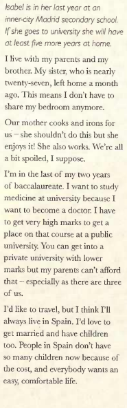 I want to go to university to get a place for studying medicine because I want to become a doctor. So that's why I need to get high marks now. I'd like traveling but I want to get married and have children and live in Spain.