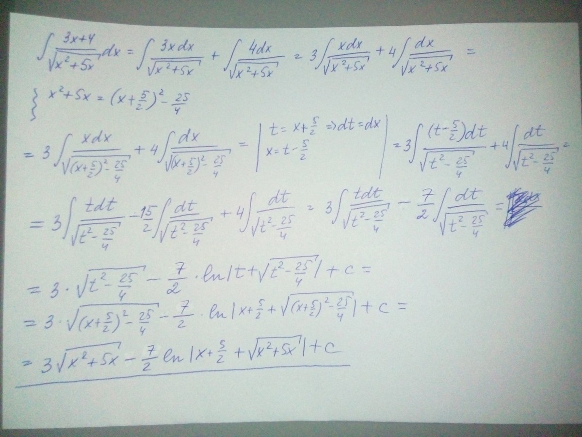 Интеграл((3/2)*(2x+5)/√(x² +5x))dx -Интеграл(7/2/√(x² +5x))dx =