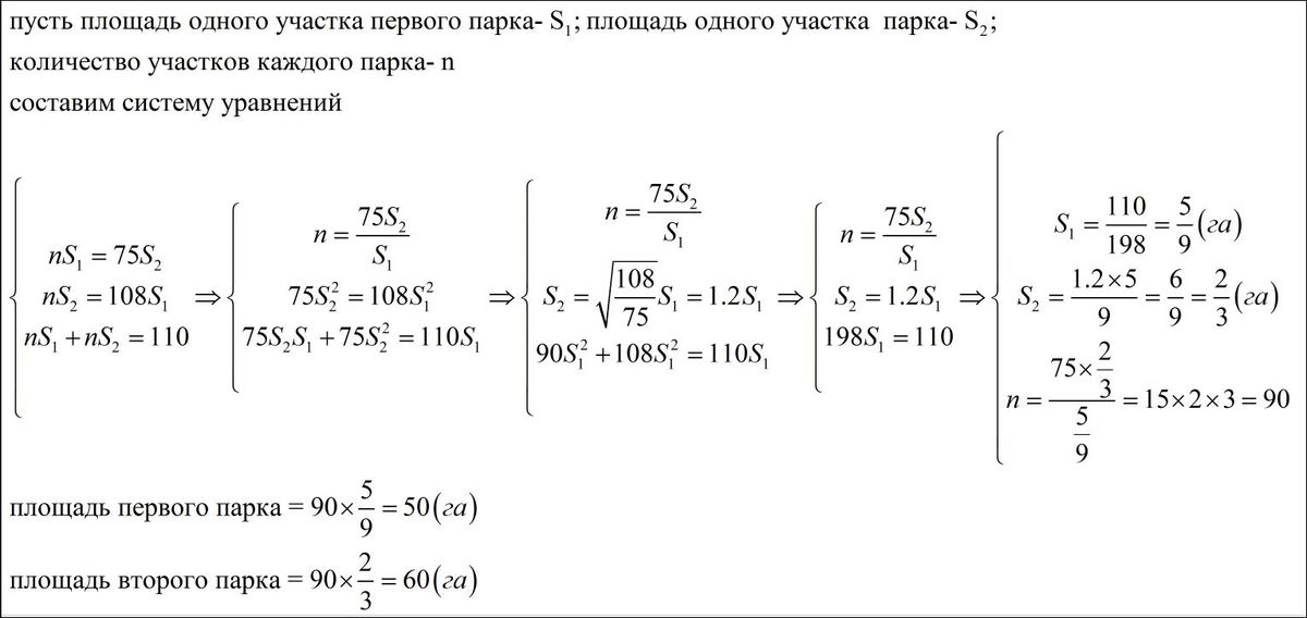 Два парка общей площадью 110 га разбиты на равное количество участков. Участники каждого парка по площади равны между собой, но отличаются от участков другого. Если бы первый парк был разбит на участки такой же площади, как второй, то он имел бы 75 участков, а если бы второй был разбит на такие же участки, как первый, то он содержал бы 108 участков. Определить площадь каждого парка.