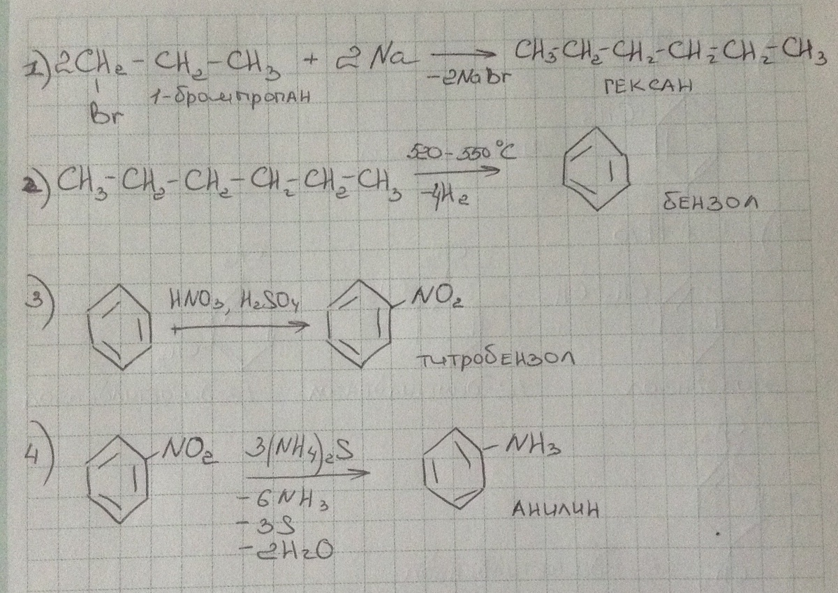 расшифровать цепочку превращений :1-бромпропан->гексан->бензол->нитробензол->анилин->2,4,6-триброманилин
