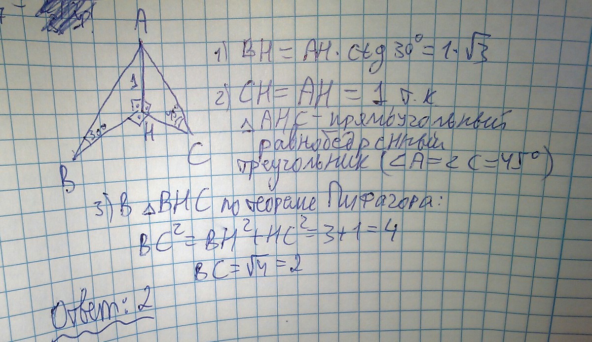 из точки от стоящей от плоскости на расстоянии 1 метра проведены две наклонные образуещие с плоскостью углы в 45 градусов и 30 градусов а между собой прямой угол найдите расстоянии между основанями наклоных