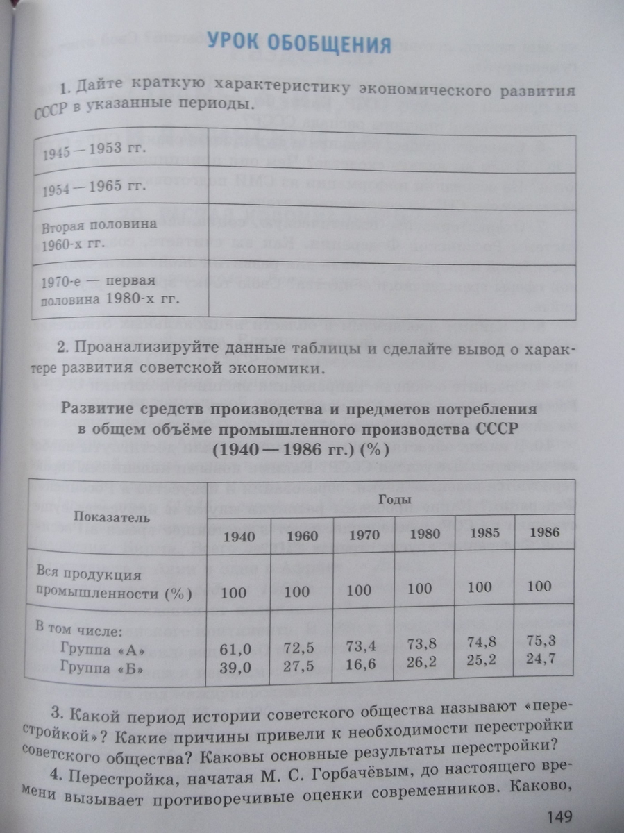 Послевоенный период. Страна понесла большие убытки, экономика находилась в "разрухе". Основная цель этого периода: восстановить довоенный уровень промышленности и с/х. Мероприятия: четвёртая пятилетка (восстановлены и построены такие крупные предприятия как Днепрогэс, Запорожсталь, Донецкий угольный бассейн, Азовсталь, Коломенский завод тяжелого машиностроения, Калужский турбинный завод и др.), денежная реформа (отменена карточная система).