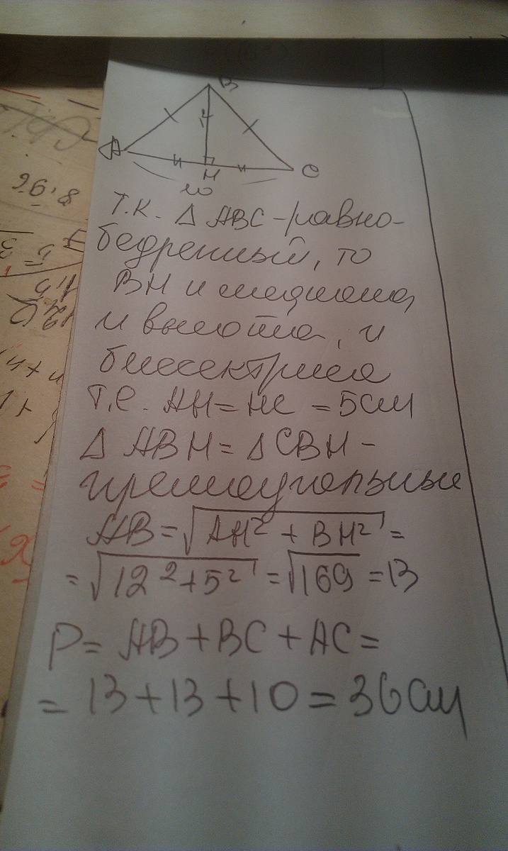 Так как медиана делит сторону пополам ,то половина основания 10:2=5 см , а треугольник равнобедренный ,то она является высотой. Значит высота, боковая сторона и половина основания образуют прямоугольный треугольник.По т.Пифагора найдём боковую сторону . Она равна √(12²+5²)=√169=13см. У равнобедренного треугольника боковые стороны равны, следовательно периметр Р=13+13+10=36 см