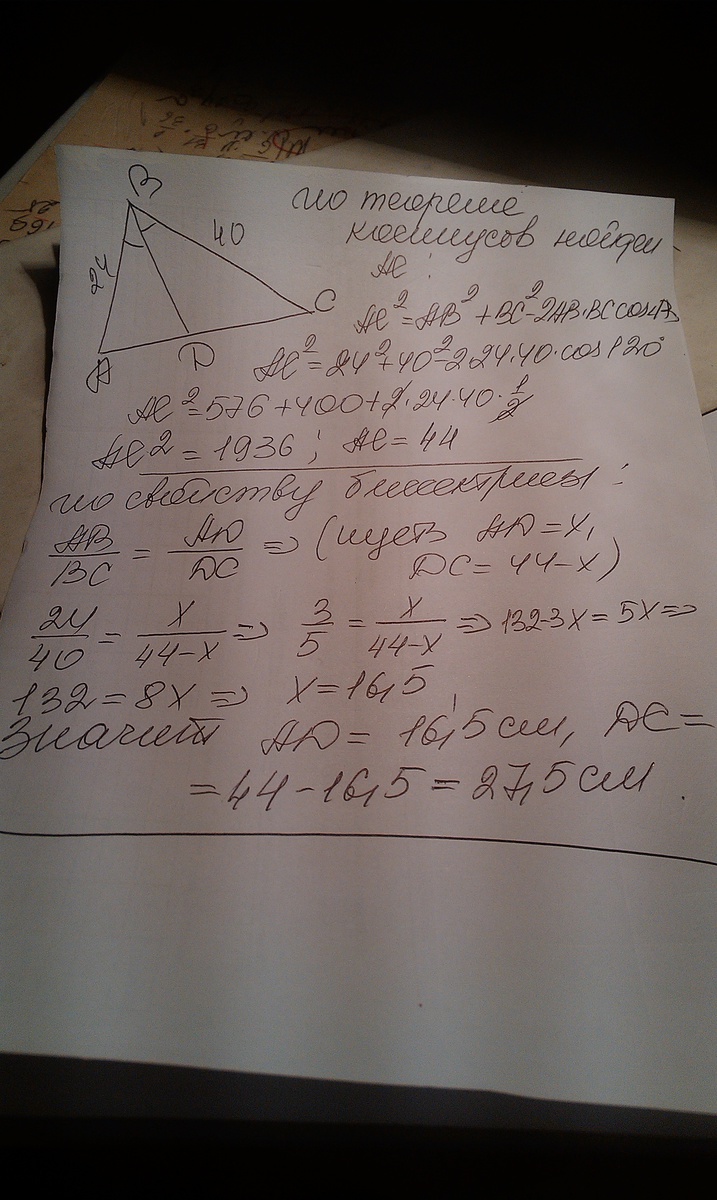 сторони трикутника дорівнюють 24 см і 40 см, а кут між ними 120 . знайти відрізки на які бісектриса даного кута ділить 3 сторону