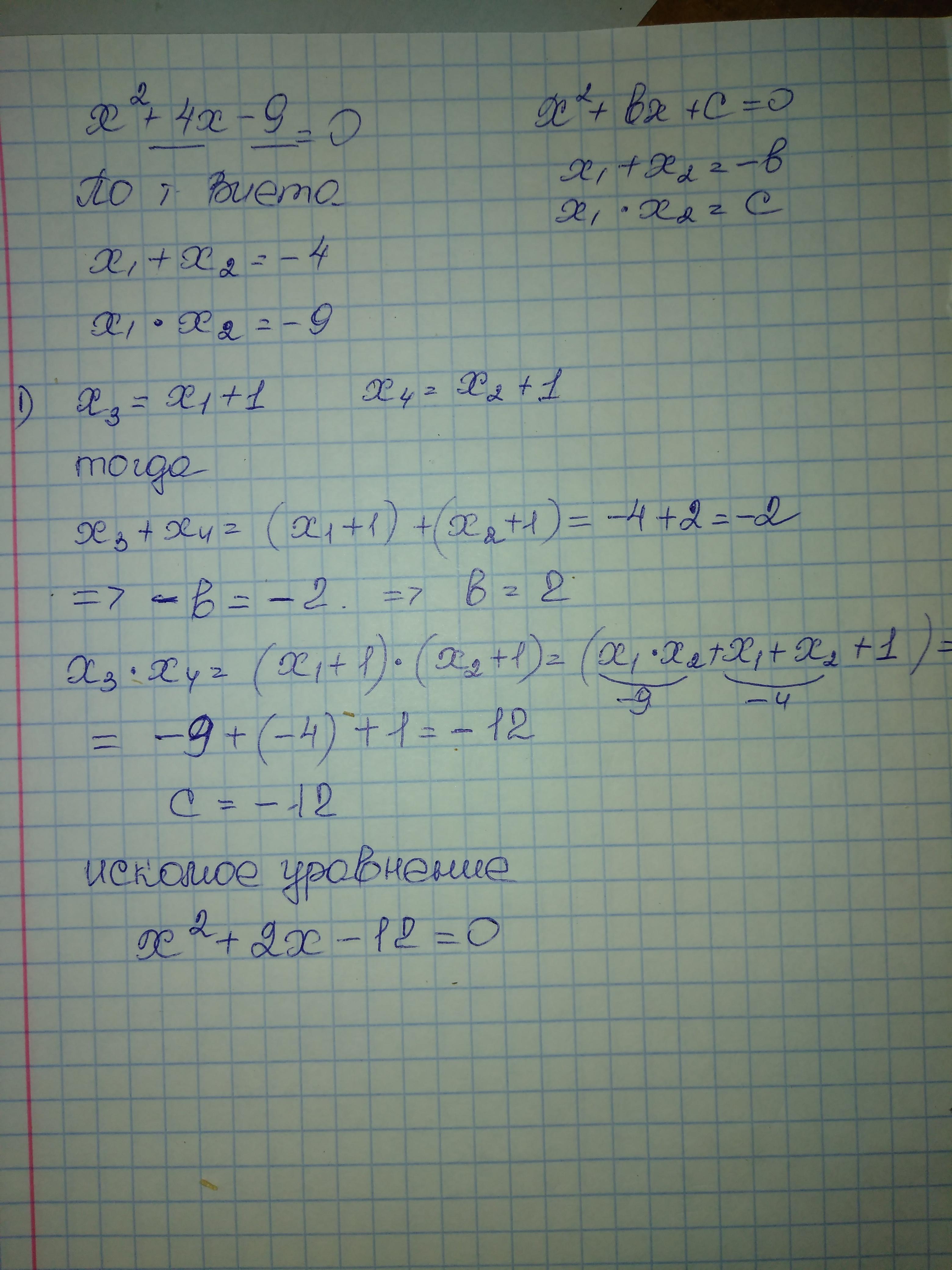 Складіть квадратне рівняння, корені якого більші за відповідні корені рівняння x^2 +4x -9=0 на одиницю