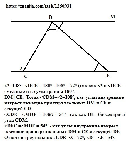 на рисунке DM//CE. луч DE-биссектриса угла CDM .угол 2 =108 градусам. найдите углы треугольника CDE.