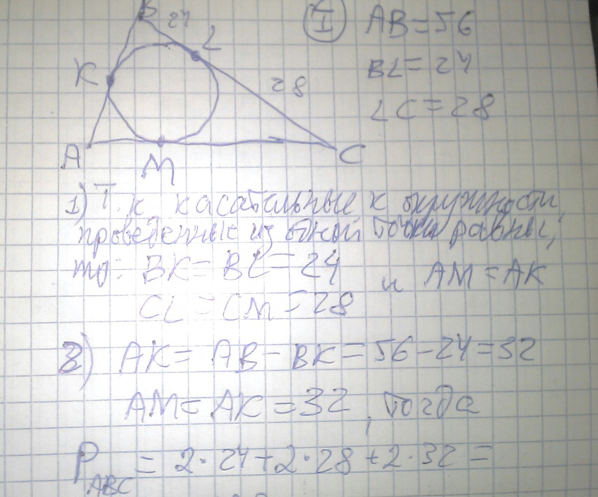 СРОЧНО ПОМОГИТЕ!!!!!!!!!!!!!!!!!!!!!!!!! У трикутнику одна з сторін дорівнює 56 см, а інша сторона ділиться точкою дотику вписаного в трикутник кола, на відрізки 24 см і 28 см. Знайдіть пери¬метр трикутника.