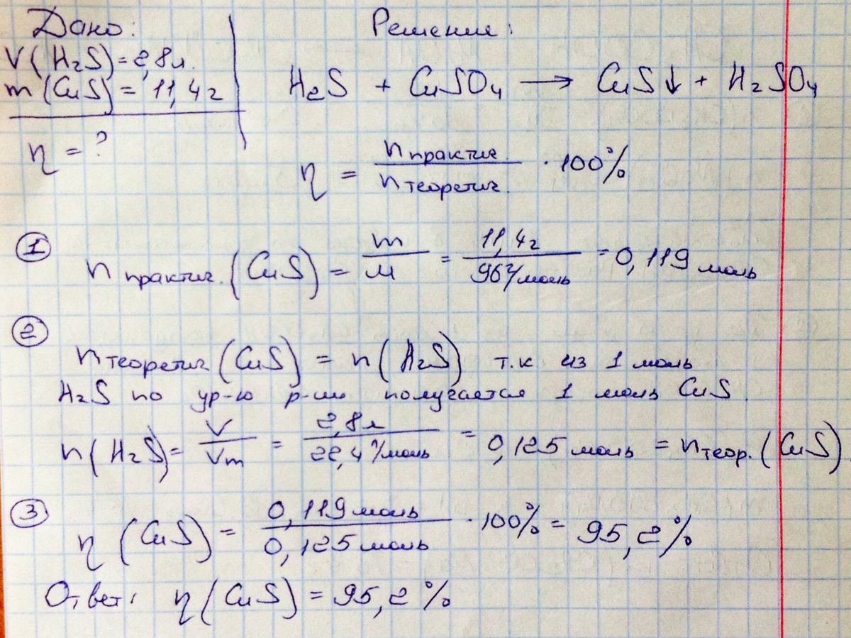 при пропускании сероводорода объёмом 2,8л.(н.у.) через избыток раствора сульфата меди образовался осадок массой 11,4г.определите выход продукта реакции?