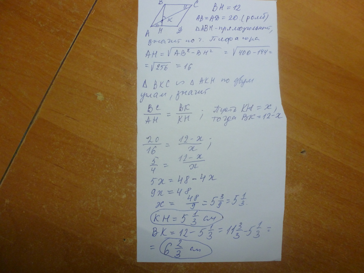 В ромбе АВСД диагональ АС пересекает высоту ВН, проведенную к стороне АД, в точке К. Найти длины отрезков ВК и КН, если сторона ромба равна 20 см, а высота 12 м.