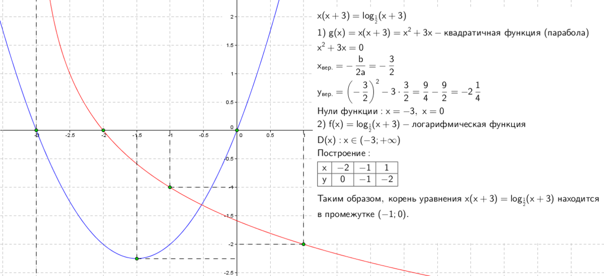 Решите графически уравнение x(x+3)=log1\2(x+3). Укажите промежуток, в котором находится его корень. Нужен график, если возможно.